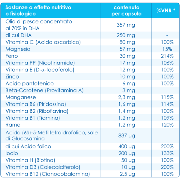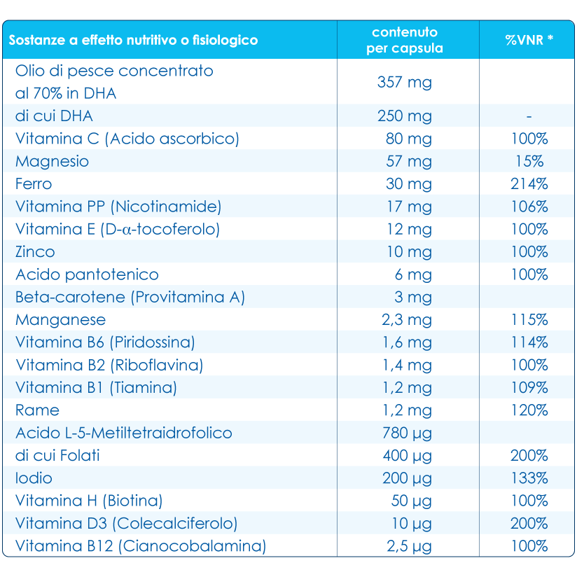 Durante la gravidanza e l’allattamento, è essenziale garantire il giusto apporto di nutrienti chiave. Il DHA è un acido grasso Omega-3 fondamentale per la salute della mamma e lo sviluppo del bambino. Numerosi studi dimostrano che il DHA contribuisce positivamente alla crescita fetale, allo sviluppo del cervello e della vista, inoltre può ridurre il rischio di parto pretermine, depressione post-partum e, nei bambini, ritardo di crescita, allergie e asma. Assunto attraverso l’alimentazione o integratori specifici, il DHA favorisce anche lo sviluppo delle capacità cognitive e psicomotorie del neonato nei primi mesi di vita.